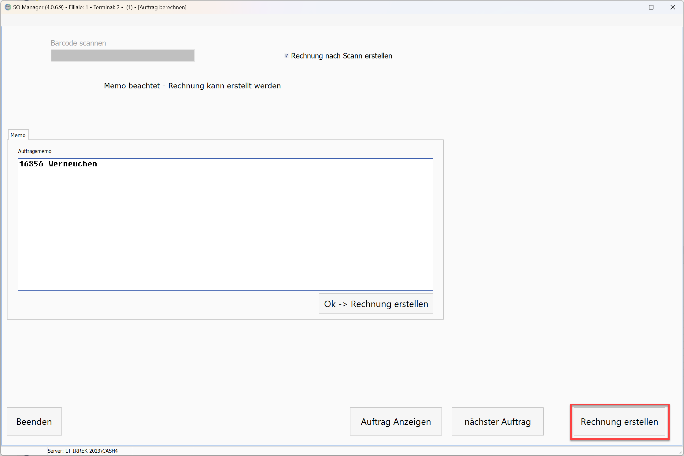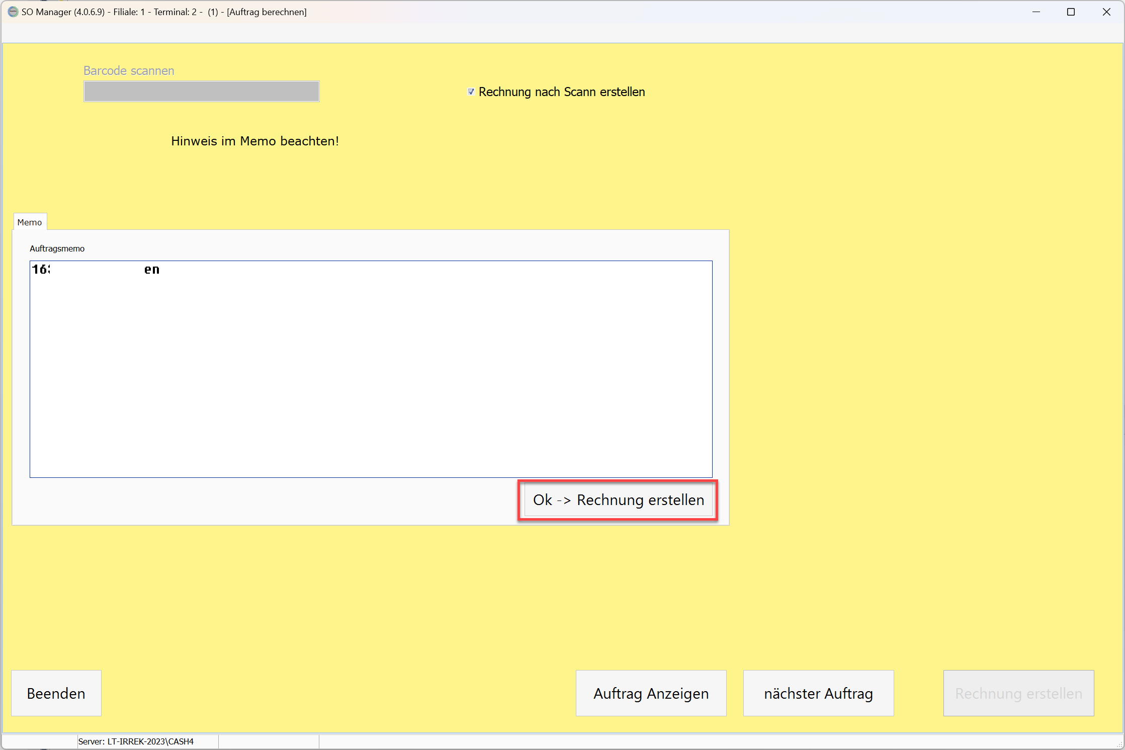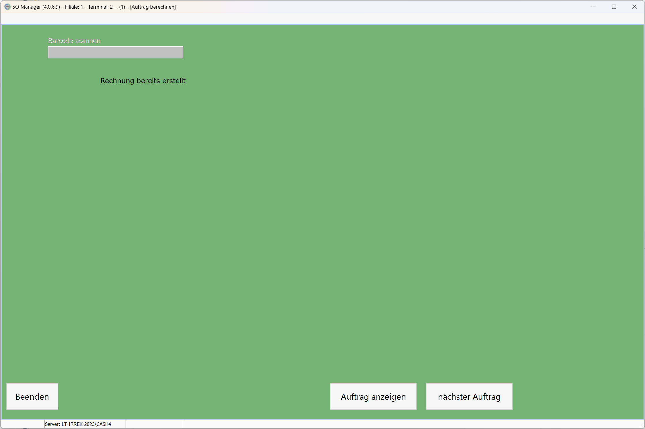 Ein Auftrag beim dem schon eine Rechnung erzeugt wurdeMit [nächster Auftrag] kann ein weiterer Auftrag gescannt werden.