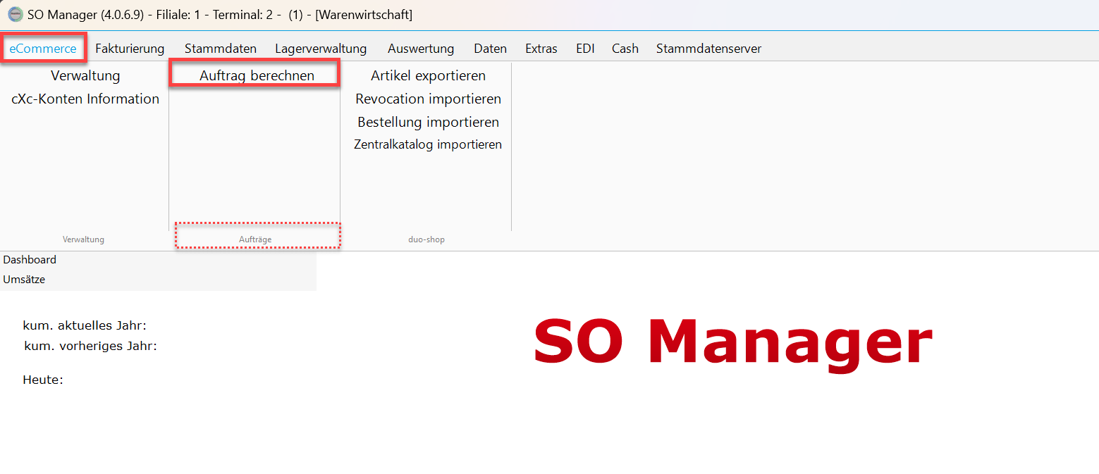 Mit der Funktion Auftrag berechnen im SO Manager [eCommerce-Aufträge-Auftrag berechnen] können eCommerce Aufträge schnell berechnet, Auftragsbestätigungen erstellt werden und die Adressdaten an die Versandprogramme übermittelt werden.